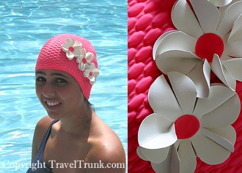 Fabulous Retro 50's style old-fashioned rubber ladies Swim Cap in Vibrant Pink, decorated with pretty Flower Petals on one side. Swim Caps like this have become extremely difficult to find, this is a beauty - you're sure to make a big splash, and turn heads, at the pool or beach in this! Made by the same company that's been manufacturing for decades in finest quality rubber with flower petals all over, it's soft and supple and easy to slip on. One size only - Adult.Swim caps really aren't meant to be watertight, your hair will get wet (our hair, ears and shape of our heads make it almost impossible to get a completely watertight seal) but by wearing a cap it helps prevent chlorine/oil etc., from damaging your hair because wearing a swim cap prevents that wash through that loose hair gets. Swim caps also helps stop loose hair covering your face while swimming, and help prevent loose hair clogging pool filters.
