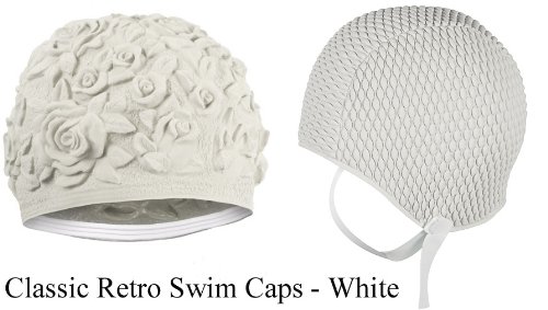 Original Traditional Swim Caps, One classic Chin Strap, and One with Textured Floral Pattern, From Draphix Corp - The only official Factory Authorized Supplier. Made in finest quality rubber they're soft and supple and easy to slip on. One size only, Adult, fits a little more comfortably than standard swim caps and easier to pull on.Swim caps really aren't meant to be watertight, your hair may well get wet (our hair, ears and shape of our heads make it almost impossible to get a completely watertight seal) but by wearing a cap it helps prevent chlorine/oil etc., from damaging your hair because wearing a swim cap prevents that wash through that loose hair gets. Swim caps also helps stop loose hair covering your face while swimming, and help prevent loose hair clogging pool filters.